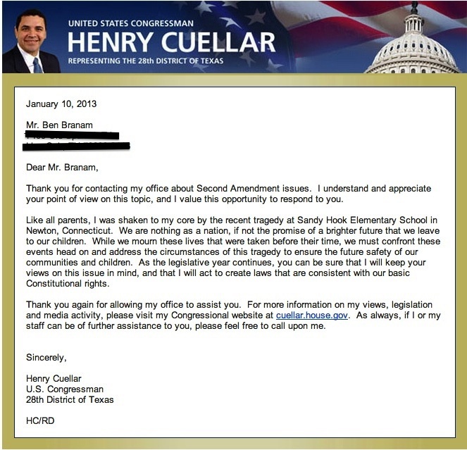 I got form letters back from all three of mine. My two senators didn’t say anything except we will respect the 2nd Amendment. Not surprising here in Texas. My congressman sent a letter with a big old BUT on it, and didn’t say anything about what he was going to do. Here is the letter he sent me back after I asked him not to vote for any gun legislation until at least March when the country could calm down from the resent tragedy and get back to work after the Holidays.